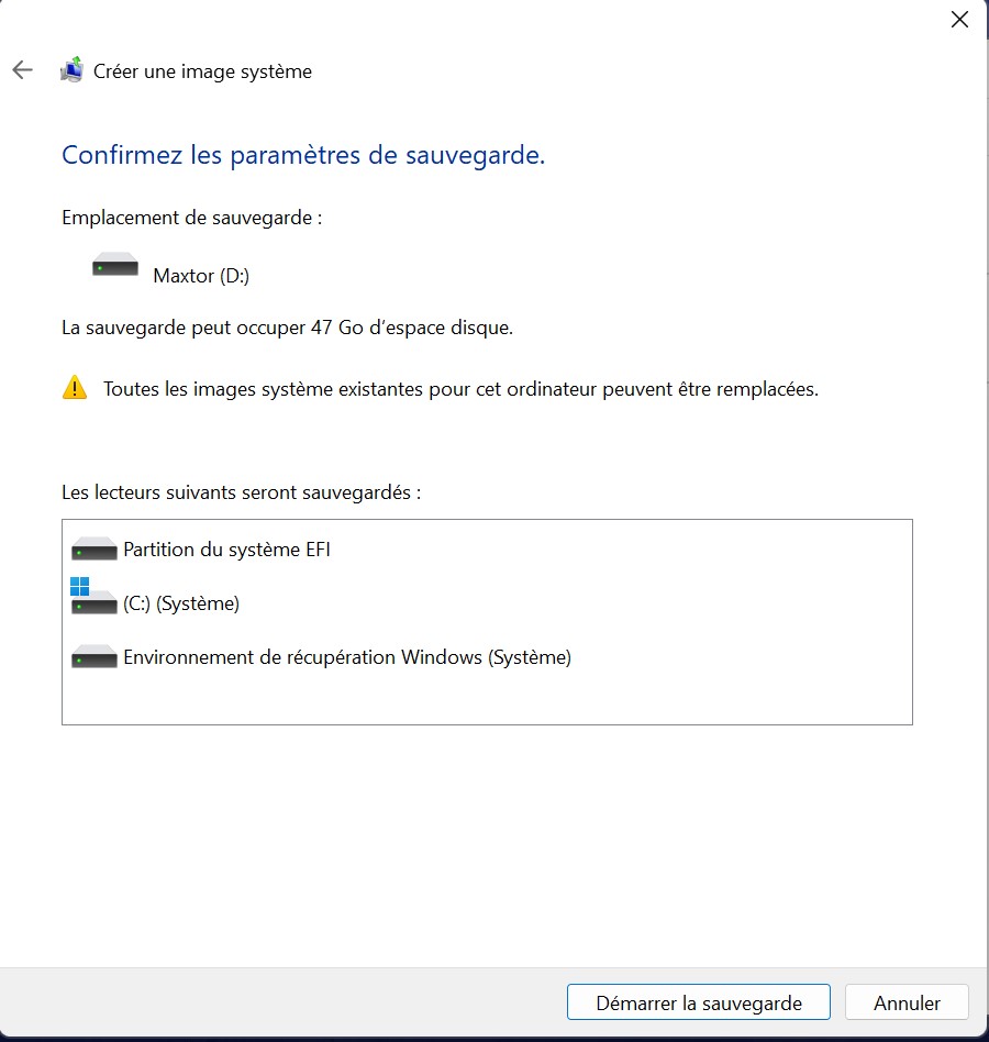 Par défaut, le lecteur C et les lecteurs cachés (nécessaires pour restaurer Windows) sont inclus dans une image système, ce qui est bien.