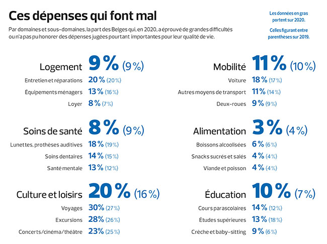Même pour ceux qui ont des difficultés à faire face aux dépenses, la situation s’est améliorée l’an dernier, notamment dans les domaines des soins de santé, du logement et de la mobilité. A contrario, l’alimentation est le domaine devenu à la fois plus important aux yeux des consommateurs et plus difficile à financer pour certains ménages.