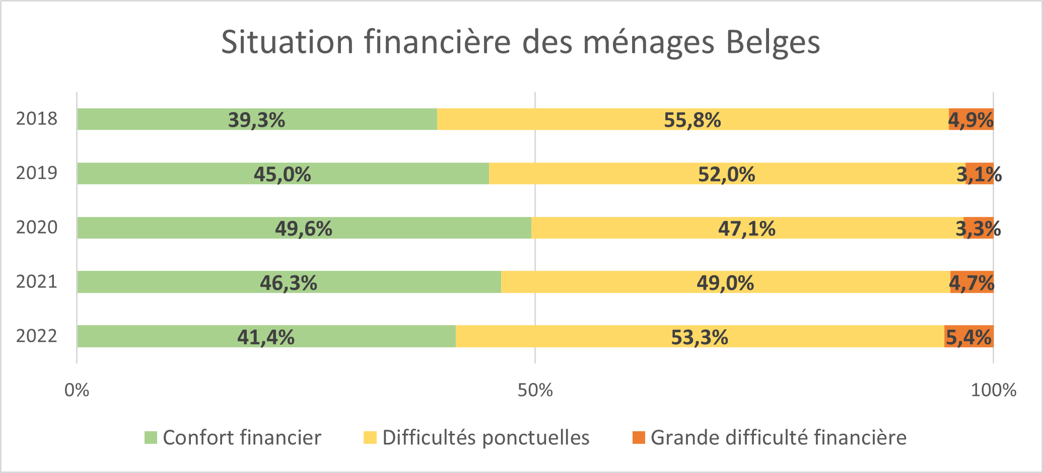Testachats remarque également que la proportion de ménages connaissant de grandes difficultés financières a à nouveau augmenté entre 2021 et 2022 : celle-ci est passée de 4,7% en 2021 à 5,4 en 2022 (+ 0,7 %).