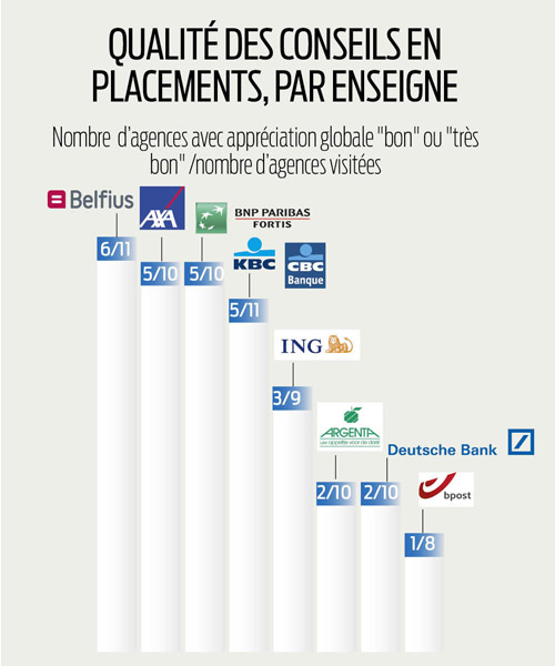 Pour chacune des 8 grandes enseignes bancaires analysées, nos enquêteurs ont visité une dizaine d’agences dans le courant du mois de novembre 2013, à Bruxelles et dans tous les chefs-lieux de province. De manière anonyme (technique du ‘client mystère’), ils avaient pris rendez-vous au préalable afin d’être reçus par un conseiller en placement.