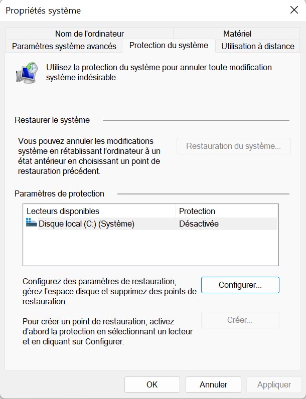 S'il est indiqué « Désactivée » derrière l'un des « lecteurs disponibles », cela signifie que la restauration du système n'est pas activée. Vous pouvez le faire via Configurer > Activer la protection du système.
