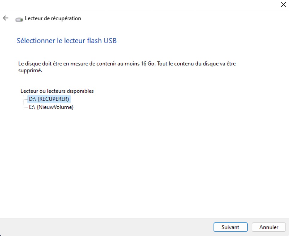 Dans cet écran, choisissez le lecteur USB sur lequel vous voulez créer le lecteur de récupération. Windows prévient qu'au moins 16 Go doivent être libres.