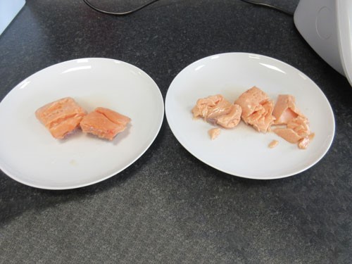 Pour la cuisson sous vide, nous avons fait cuire deux filets de saumon à 52° pendant 30 minutes. Sans préchauffage, le saumon était encore cru. Avec préchauffage, il était cuit au bout de 36 minutes et demie.