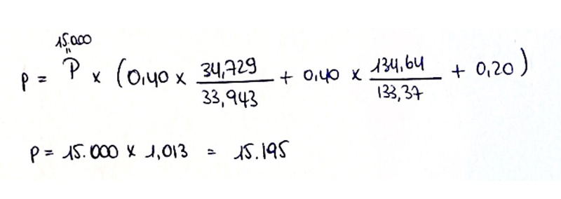 Voici un exemple chiffré où le prix convenu est de 15000€, mais après application de la formule de révision de prix, le nouveau prix est de 15195€: