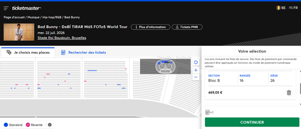On vous affiche un billet “à partir de 158 €”, mais dans les faits, il n’y a pas de billet à ce prix-là. Pour Bad Bunny, par exemple, le billet le moins cher dans la section indiquée coûtait 296 €. - Des prix impossibles à comprendre