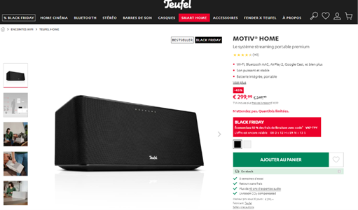 Autre exemple : Teufel annonce un prix promo de 299€, prix barré de 549€ soit une réduction de 45%. Or, ce prix de 549€ n’a pas été pratiqué les 30 derniers jours. Le prix barré à utiliser était de 399€.