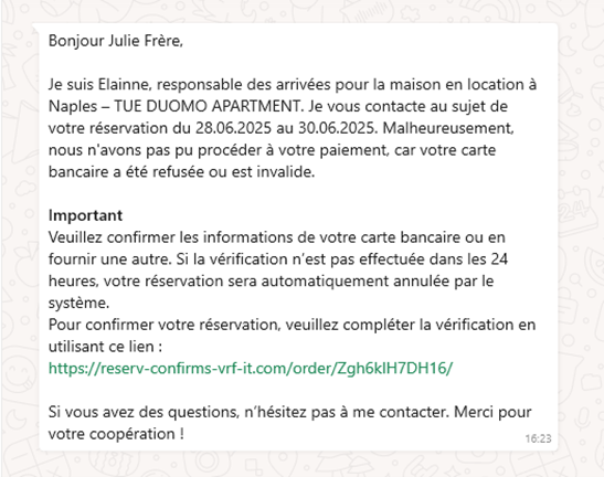 Souvent, les victimes reçoivent un message, via WhatsApp ou même directement sur la plateforme Booking.com, d’un individu se faisant passer pour un.e responsable des réservations, prétendant que le paiement n’a pas été effectué correctement et que la réservation sera bientôt annulée. Les victimes reçoivent ensuite un email trompeur qui semble avoir été envoyé par Booking.com, appuyant la première tentative de phishing. Etant donné que toutes les données sont correctes, y compris le nom de l’hôtel, les dates de la réservation, le numéro de téléphone de la victime et l’adresse email Booking.com, il est facile de tomber dans le panneau. Et cela peut coûter très cher aux voyageur.ses qui ne s’en rendent pas compte à temps…