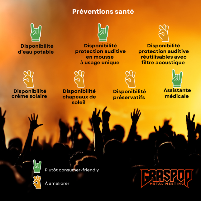 En matière de prévention santé, le Graspop a mis en place les initiatives suivantes :