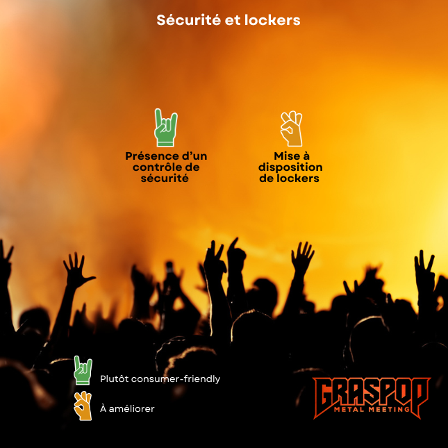 Un contrôle de sécurité est effectué à l’entrée du site et une zone de lockers (casiers) est mise à disposition des festivaliers pour ranger leurs affaires.