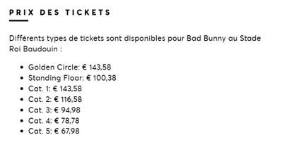 Ticketmaster vend des billets “classiques”, avec des prix affichés sur son site web. Par exemple, pour le concert de Bad Bunny du 22 juillet prochain, il existe 7 catégories de billets, chacune avec son propre tarif. Les plus chers, les plus proches de la scène, sont les billets Golden Circle ou Catégorie 1, vendus à 143,58 euros.