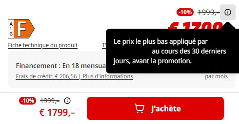 Cependant Testachats observe à nouveau que certains magasins n’hésitent pas à utiliser divers stratagèmes pour donner l’impression qu’une promotion est plus intéressante qu’elle ne l’est vraiment. Par exemple, un réfrigérateur censé bénéficier d'une remise de 31 % (719 euros au lieu de 1.039 euros), ne bénéficie en réalité que d'une remise d'un peu moins de 8 %, puisque ce réfrigérateur était proposé à 779 euros dans les 30 jours précédant cette promotion, comme le montre le tableau des prix tenu par Testachats.