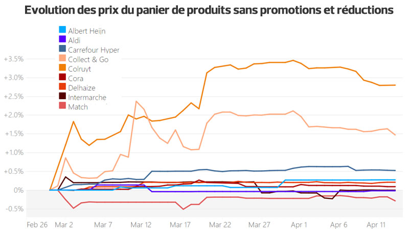 Si l'on compare les prix par rapport à la période d'avant la crise (1er mars), les prix ont le plus augmenté dans les hypermarchés Carrefour (+5%), Collect & Go (+5%) et Colruyt (+6,6%). A l'inverse, les prix sont restés stables chez Aldi, Intermarché et Match.