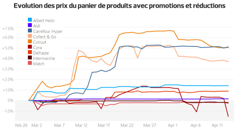 L'effet de la suppression des promotions et réductions diffère d'un supermarché à l'autre. Les 19 et 20 mars, un effet net est visible dans les hypermarchés Carrefour (+2,2%), Colruyt (+1,8%), Collect & Go (+1,6%) et Delhaize (+0,7%). Chez Cora, la hausse des prix après le 19 mars est plus progressive (+1,1%).