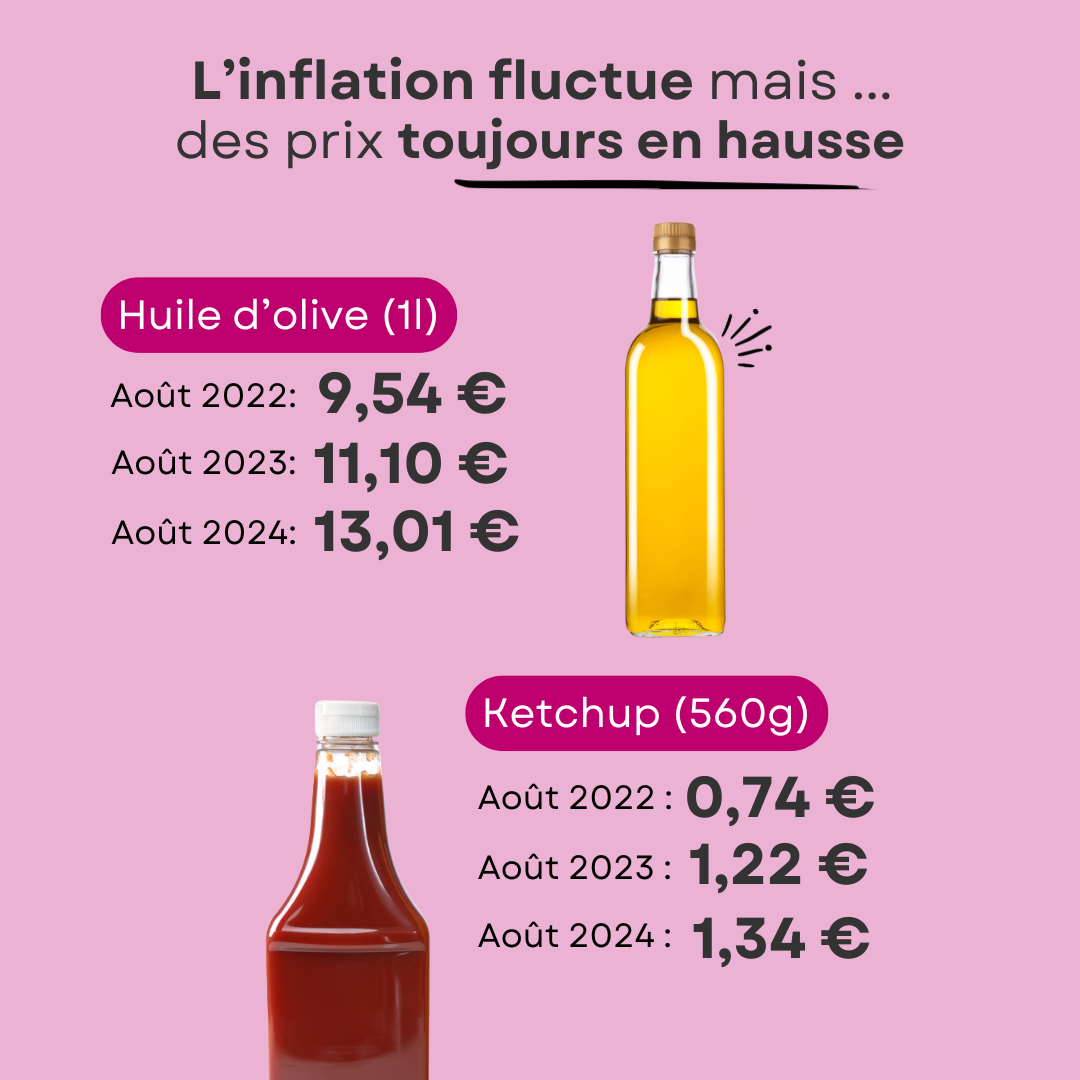 Les catégories de produits ayant le plus augmenté sont les boissons rafraichissantes (+7%) ainsi que les légumes et les produits d’épicerie (+4%). Quand on y regarde de plus près, on retrouve sans surprise l’huile d’olive (+27%) parmi les produits ayant connu la plus forte augmentation en un an, à côté des jus d’orange (+23%), en raison de mauvaises récoltes d’oranges et des fondants au chocolat (+22%) en raison de la hausse du prix du cacao.