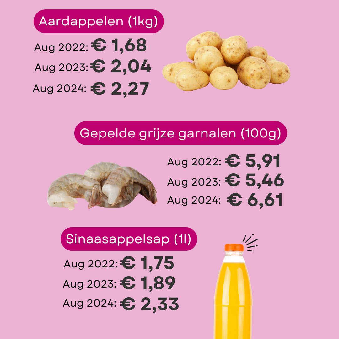 Bien que l’inflation se tasse, le panier de Testachats est toujours 27% plus cher qu’en janvier 2022, mois durant lequel l’inflation a dépassé les 2% pour la première fois. Le ketchup est ainsi 85% plus cher qu’en janvier 2022, l’huile d’olive est ainsi 66% plus chère et les pommes de terre 53% plus chères et les crevettes grises 42% plus chères.