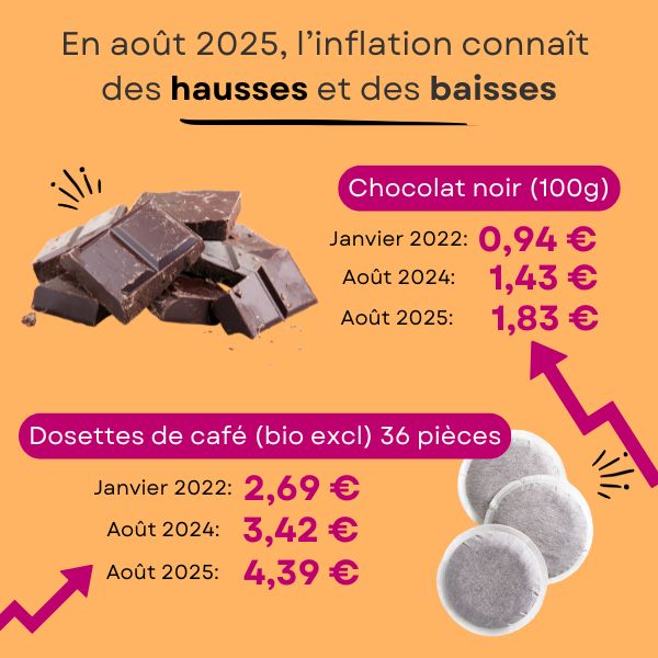 Quand on regarde le top 10 des produits ayant le plus augmenté on retrouve sans surprise les produits contenant du chocolat dans les plus fortes hausses : le chocolat au lait (+41%), le chocolat noir (+36%) et les biscuits au chocolat (+23%). On y retrouve toujours également le café en pads (+26%) ou moulu (+17%). Mais également la viande de bœuf : l’américain non-préparé (+18%), l’entrecôte, le haché porc-veau (+18%) et le ragoût de bœuf (+12%).
