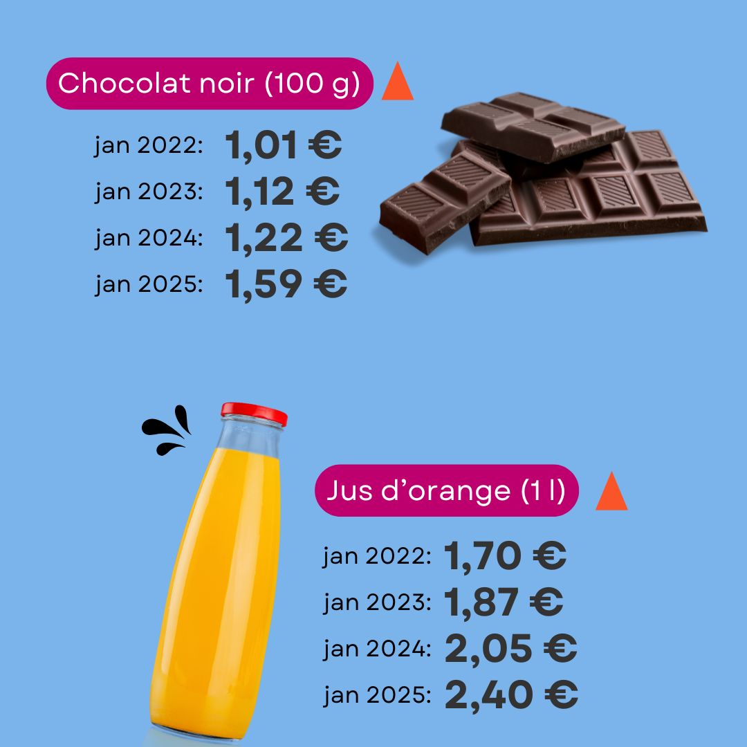 Les catégories de produits ayant le plus augmenté sont les boissons rafraichissantes (+7%), les produits d’épicerie (+5%), les produits surgelés (+4%) et la viande (+4%). Quand on y regarde de plus près, on retrouve sans surprise le chocolat noir (+28%) et les jus d’orange (+21%) dans le top 3 des produits ayant le plus augmenté en un an. Mais ce mois-ci, on y retrouve également les pommes Granny (+24%), en raison de réserves moins élevées que les années précédentes.
