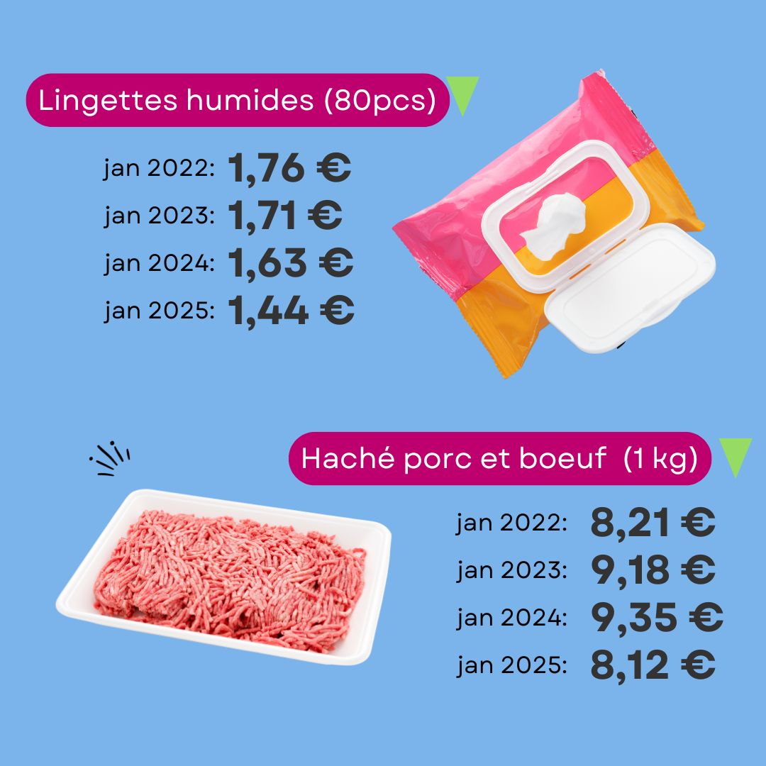 A l’inverse, le prix de certaines catégories de produits stagne ou diminue légèrement. C’est le cas des légumes (-0,3% en excluant les pommes de terre), les produits de soin (0%), ou les produits d’entretien (+0,3%). Les produits ayant le plus baissé depuis un an sont le hâché porc-bœuf (-10%), l’huile de friture (-6%) et les lingettes pour bébé (-6%).