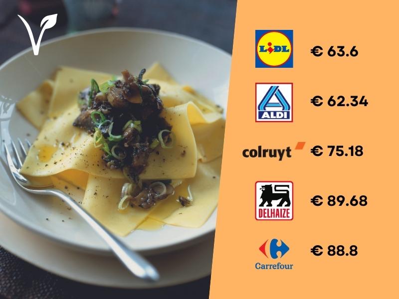 Les ingrédients les plus chers du menu sont les bouteilles de Calvados (pour le plat principal) et de Grand Marnier (pour le dessert), mais sans ces deux bouteilles, Colruyt apparaît comme le magasin le moins cher. Certains ingrédients (pâte filo, certaines épices, etc) n’étaient toutefois pas disponibles chez Aldi.