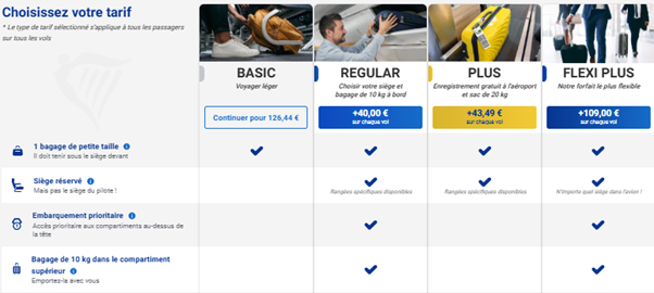 Une fois le vol choisi, le passager doit choisir entre différents forfaits : Basic, Regular, Flexi Plus of Plus. S’il souhaite prendre un bagage à main, tout mène à croire qu’il doit opter pour le tarif « Regular ». En optant pour ce forfait, il aura également droit à l’embarquement prioritaire et à un siège réservé, ce qui n’est pas forcément nécessaire. En réalité, il est parfaitement possible d’opter plus tard pour ces options séparément, en ne choisissant dès lors que celles dont le passager a réellement besoin, et à moindre coût. Mais Ryanair se garde bien de l’indiquer au moment du choix du forfait, et d’indiquer le prix des services accessoires, afin de pousser à l’achat des forfaits plus onéreux. Pourtant, là aussi la loi prévoit que le prix définitif doit être précisé dès le début du processus de réservation. Le juge confirme l’illégalité de la pratique.