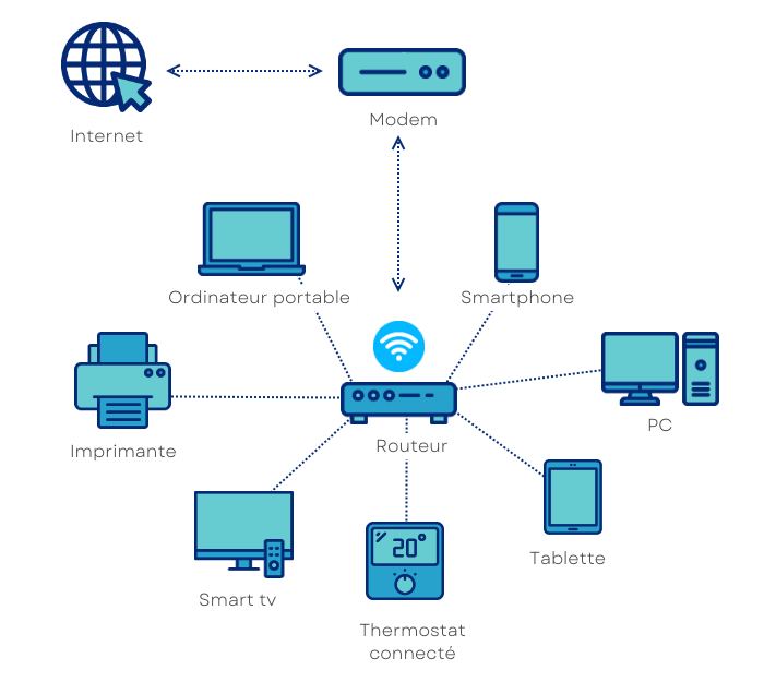 Un routeur est un appareil qui gère le trafic des données entre les appareils de votre réseau local (comme des ordinateurs, des smartphones, des tablettes) et le modem. Il prend les données qui arrivent du modem et les distribue aux appareils appropriés sur le réseau local. Il gère également les demandes sortantes des appareils et les achemine vers internet.