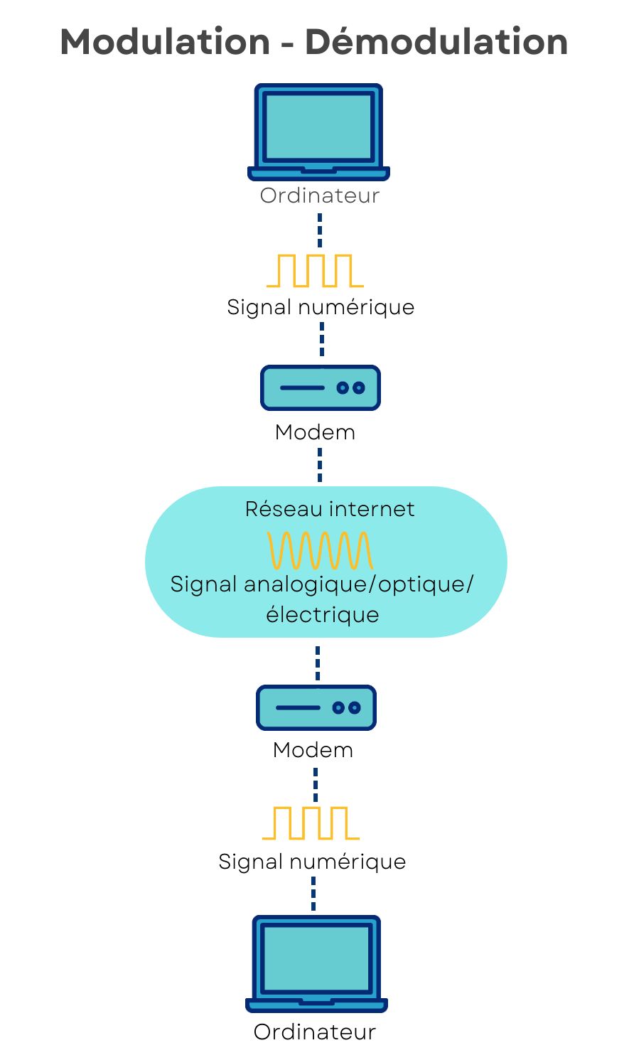 Vos appareils (ordinateur, smartphone, tablette…) produisent des données numériques qui ne peuvent pas circuler directement sur les supports physiques du réseau. Le modem transforme donc ces données numériques en signaux adaptés au réseau : signal analogique (ligne téléphonique), signal électrique (câble coaxial) ou signal optique (fibre).