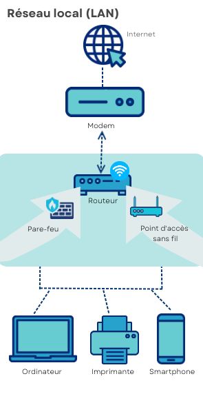Un routeur distribue le signal internet (WAN) entre tous les appareils de votre réseau local (LAN) et assure la communication entre eux (ordinateur, ordinateur portable, imprimante, smartphone, tablette, etc.). Il agit comme un gardien qui décide pour qui la porte s'ouvre et qui doit rester à l'extérieur.