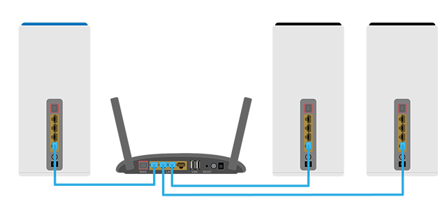 Avec le backhaul Ethernet, vous connectez l'unité principale à l'internet et utilisez un deuxième câble Ethernet pour la connexion câblée à l'unité maillée suivante. Chaque unité sera donc connectée à l'unité principale par l'intermédiaire d'un câble. De cette manière, les données sont transmises entre deux unités via Ethernet, ce qui permet une connexion plus rapide et plus stable que le Wi-Fi.