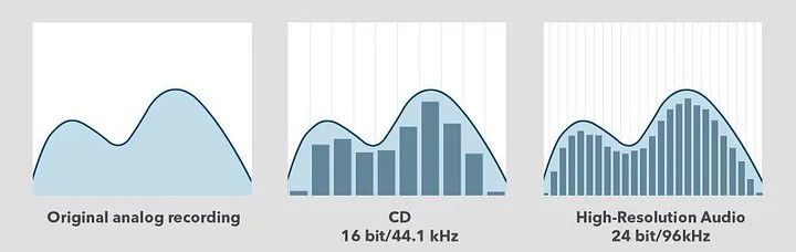 À gauche de l'image ci-dessus, vous pouvez voir l'enregistrement de la source sonore, au milieu une quantification 16 bits de qualité CD standard et à droite une quantification audio haute résolution 24 bits. L'image de droite montre que chaque étape est plus petite et se rapproche donc davantage de la courbe du signal original. Ainsi, une quantification plus élevée ou un débit binaire plus élevé signifie plus de détails. Mais l'original n'est toujours pas reproduit à 100 %.