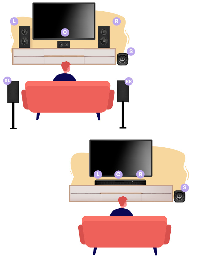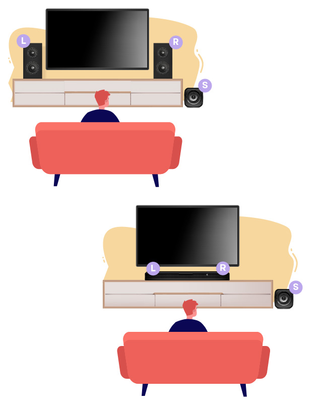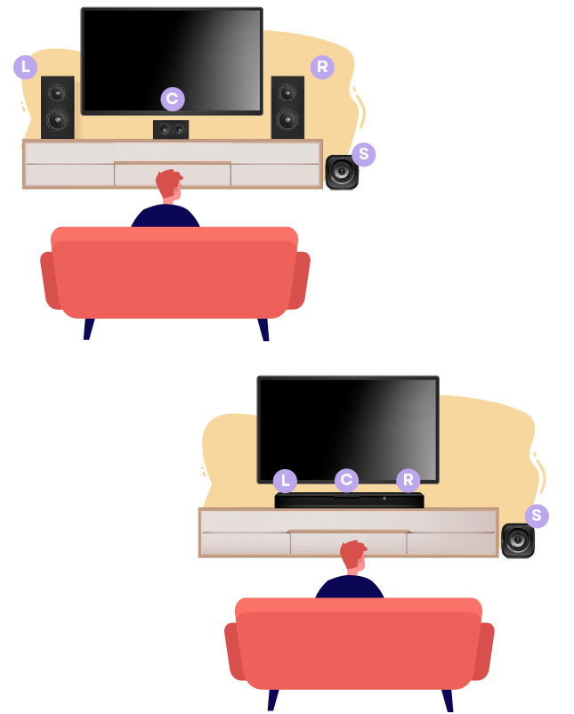 A gauche, une installation classique avec des haut-parleurs ordinaires: de part et d'autre de l'écran, des haut-parleurs (subwoofer), et au sol, de préférence dans un coin de la pièce, le caisson de basses.