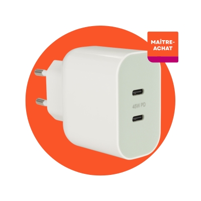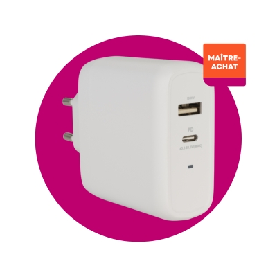 Pratique et efficace, ce chargeur possède deux ports USB-C avec une puissance clairement indiquée pour chacun. Pour son prix (40 € en moyenne), nous nous attendions à avoir un câble USB fourni avec le chargeur, mais il faudra malheureusement l'acheter en plus.