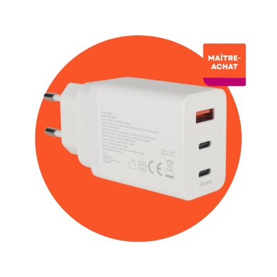 Avec une puissance annoncée de 65W et une puissance mesurée de 66W, le chargeur Kruidvat World nous a agréablement surpris, ce qui lui vaut également le titre de Maître achat. Doté de deux ports USB-C et d’un port USB-A, il se montre particulièrement pratique en voyage grâce à ses adaptateurs inclus pour les prises américaines, britanniques et néo-zélandaises.