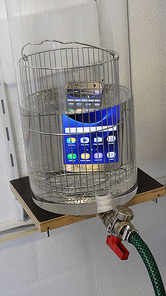 Nous immergeons les modèles certifiés étanches (IP67-68) pendant 30 minutes sous 1 ou 1,5 m, en fonction de leur indice d’étanchéité. Cela permet de vérifier si les spécifications annoncées sont correctes ou non. Si le mobile n’est pas certifié étanche, il ne subit pas ce test.