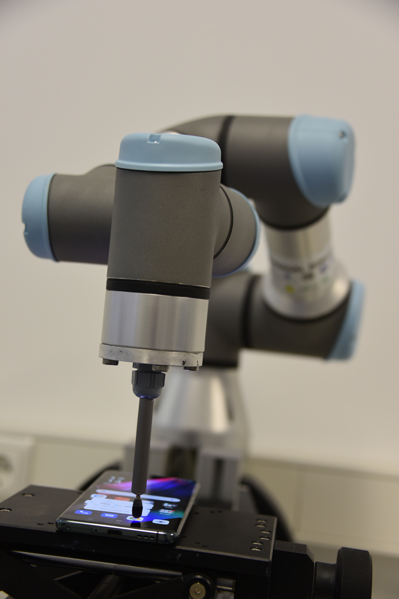 Au cours de ces tests, nous utilisons un bras robotique afin que le scénario de test soit scrupuleusement identique d’un appareil à l’autre.