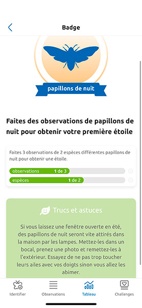 Vous trouverez également dans cette application des défis et des badges pour les observations réalisées.