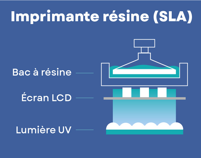 Les imprimantes 3D de type SLA, aussi appelées imprimante 3D résine, sont destinées à confectionner des objets plus complexes et fonctionnent de manière différente : au lieu d'un laser, elle utilise une lumière UV combinée à un écran LCD.