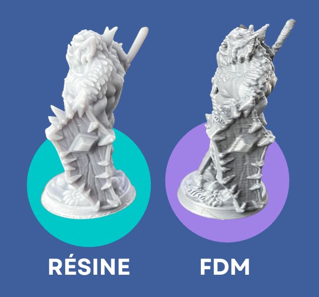 À gauche, un objet imprimé avec une imprimante à résine, à droite avec une imprimante FDM.