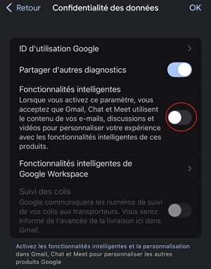 Ici, vous trouverez toute une série d’options (la plupart probablement déjà cochées) permettant à Gmail d’analyser le contenu de vos e-mails pour activer des fonctionnalités liées à l’IA. Retirez la coche de ces options – en particulier à côté de “Fonctionnalités intelligentes”, car c’est ce paramètre qui donne le consentement pour la lecture des e-mails à des fins commerciales et de profilage publicitaire.