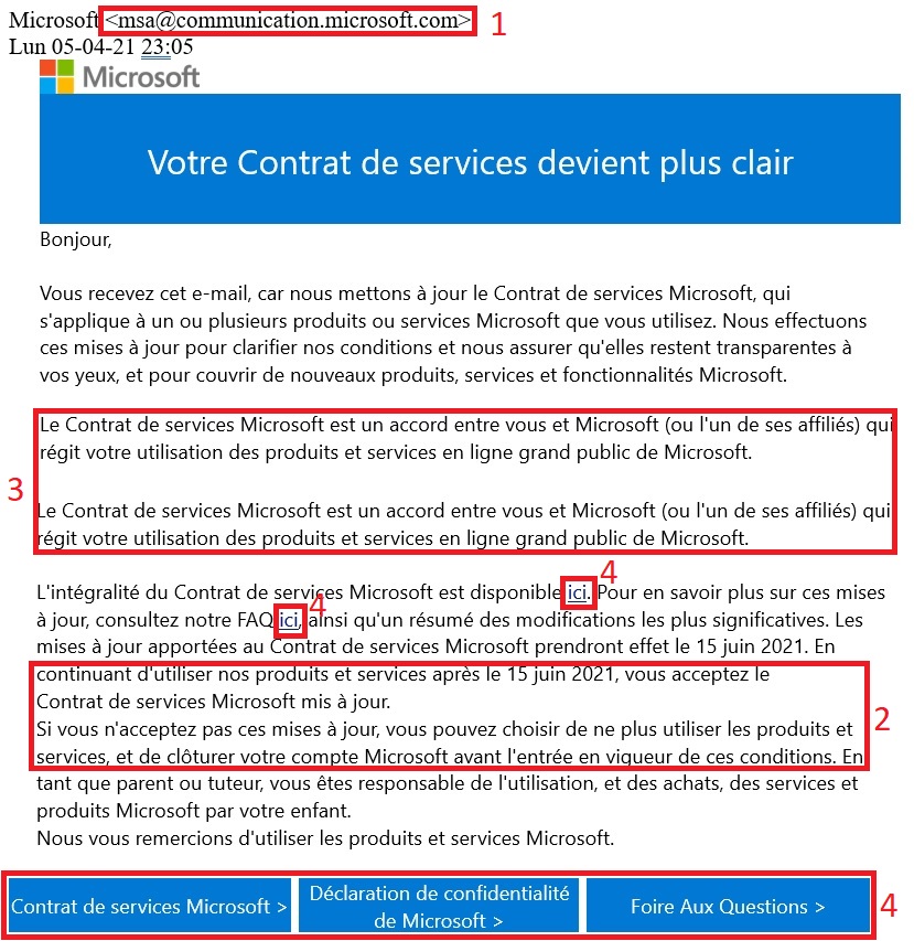 L’information ne vous est donc pas demandée, mais au contraire donnée : jusqu’au 15 juin 2021, vous êtes libre de refuser les nouvelles conditions de Microsoft, mais votre compte sera alors clôturé. Nous avons vérifié, la modification ne fait qu’apporter une clarification de quelques sections dans les conditions générales d’utilisation. Vous pouvez donc ignorer cet e-mail sans crainte et continuer à utiliser votre compte.