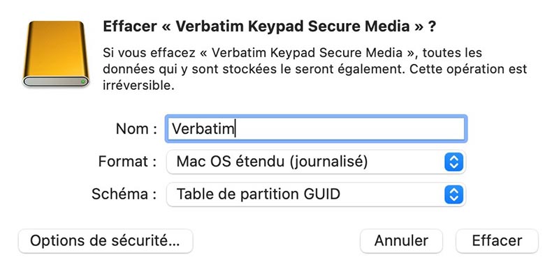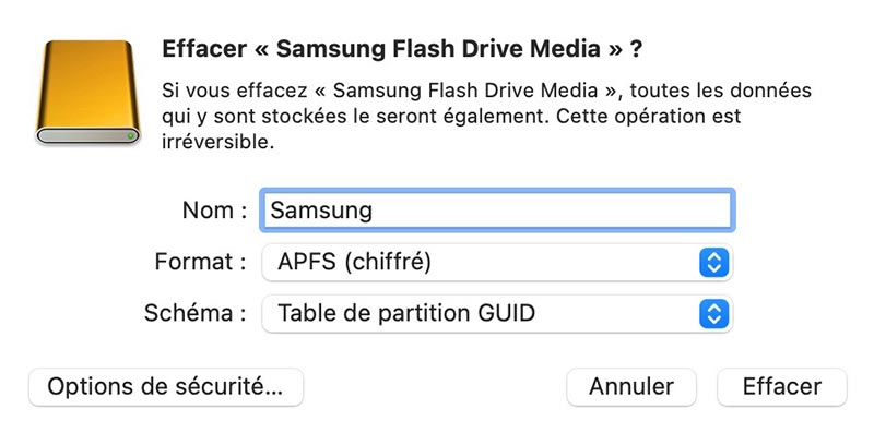 Lorsque vous définissez un mot de passe, MacOS formate d'abord le support de données (ce qui efface son contenu). Faites donc une sauvegarde au préalable afin de pouvoir restaurer les données par la suite ou configurez la sécurisation avant de charger vos données sur le support.