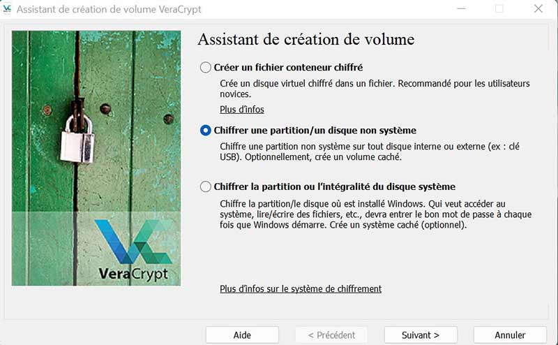 - Choisissez Chiffrer une partition/un disque non système pour crypter l'ensemble de votre clé USB, puis Volume VeraCrypt standard.