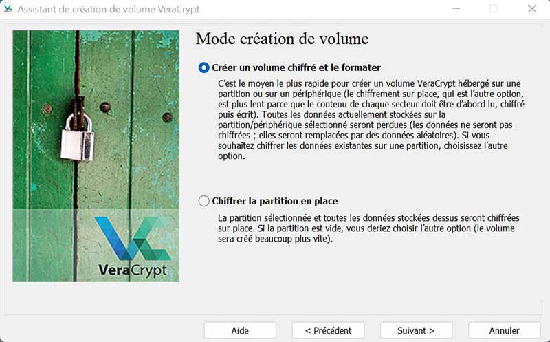 - Vous arrivez à l'écran mode création de volume. Choisissez Créer un volume chiffré et le formater.