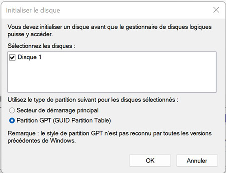 - Windows reconnaît automatiquement la clé USB à initialiser. Choisissez GPT comme style de partition et cliquez sur OK.