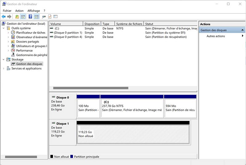 - Cliquez avec le bouton droit de la souris sur Ce PC > Gérer. Choisissez Stockage > Gestion des disques.
