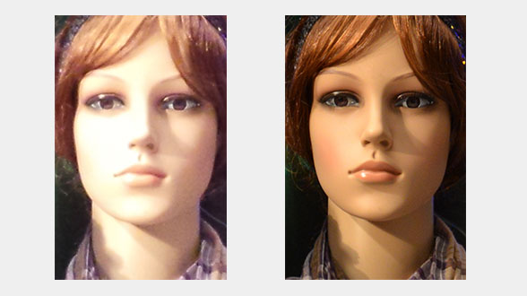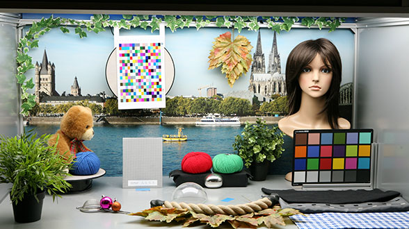 Ces photos montrent une partie seulement de notre scène test utilisée pour évaluer la qualité des photos de portrait. Les rendus sont très différents : sur la photo de droite, le teint de la peau est beau, et la peau semble naturelle. Sur la photo de gauche par contre, le teint n’est pas beau et la photo est surexposée. Le niveau de détails et la netteté sont également meilleurs sur la gauche. Ces deux photos ont été prises dans des conditions strictement identiques : éclairage et scène de test sont scrupuleusement identiques pour comparer les photos d’appareils différents.