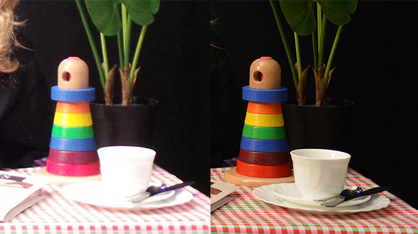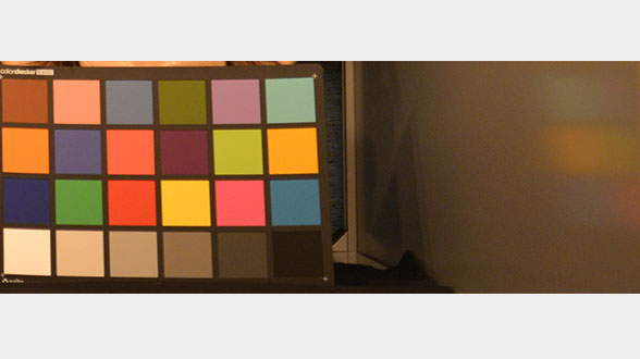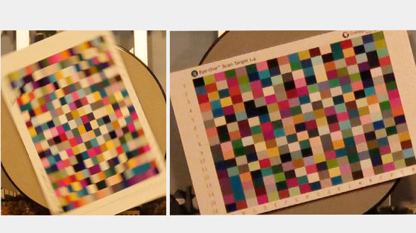 Notre scène test utilisée pour les photos en basse lumière contient une petite charte de couleur qui est placée en position verticale sur une plaque tournante. Cette charte de couleur tourne donc sur elle-même durant les prises de photos. Ce test est très contraignant pour les appareils, car outre la faible luminosité, le mouvement continu du sujet (en rotation) contribue encore plus à rendre la photo floue. Mais ce test permet clairement de distinguer les bons des mauvais appareils.