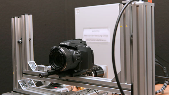 Sur cette photo, on voit le vibrateur électrodynamique sur lequel est posé l’appareil photo. Les vibrations sont ainsi transmises à l’appareil qui doit, en théorie, contrecarrer ces tremblements durant les prises de photo et faire en sorte que l’image soit nette malgré les mouvements. Ce test permet donc d’établir si le stabilisateur d’image joue bien son rôle.