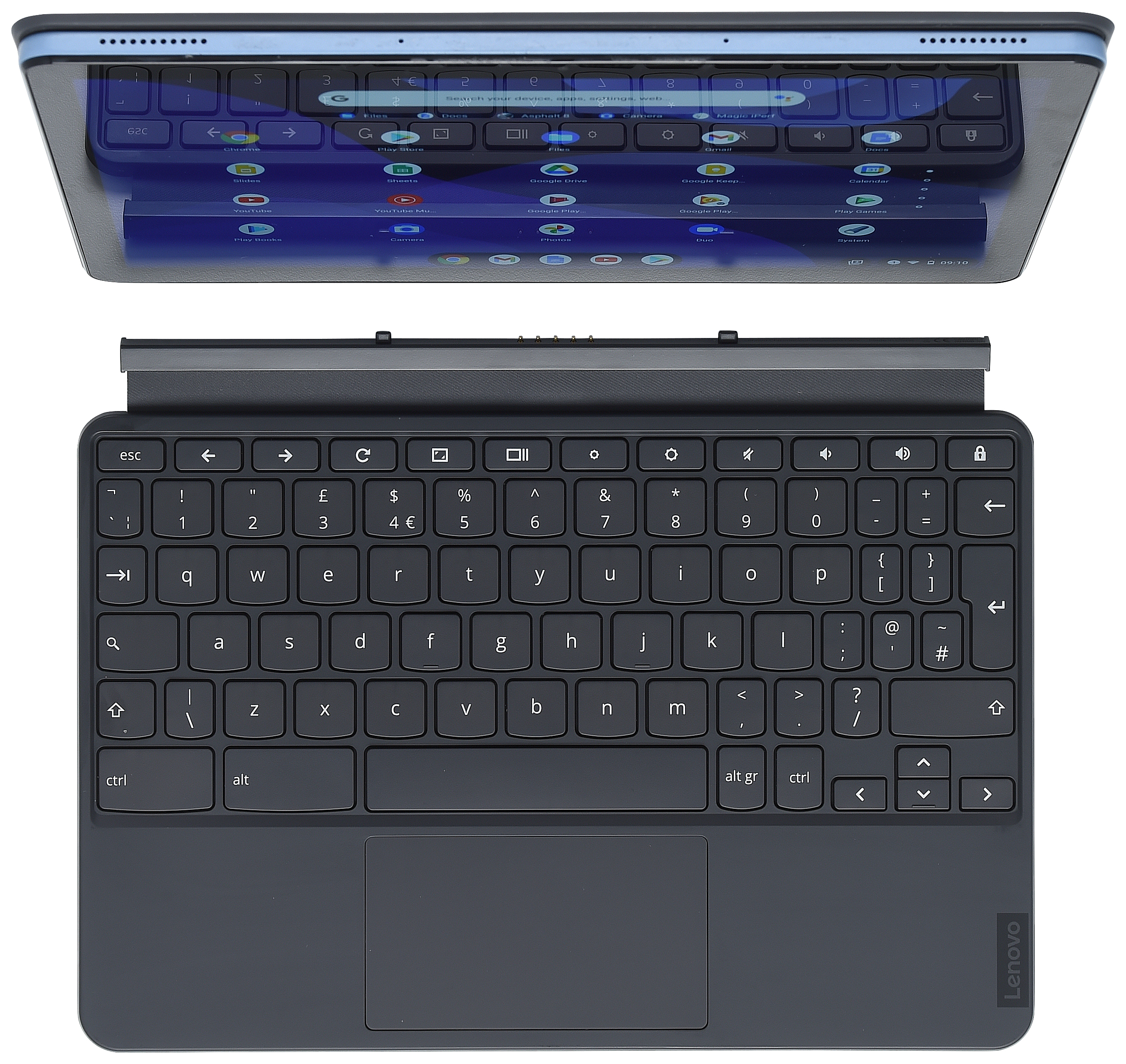 Le Chromebook IdeaPad Duet de Lenovo se compose d'une tablette, d'un clavier détachable et d'un étui de protection qui se fixe de façon magnétique, que l'on peut utiliser comme support d'écran (et l'orienter à son gré). L'appareil est livré avec un chargeur, un câble USB-A vers USB-C et un convertisseur de câble audio (USB-C vers 3,5 mm). Avec sa diagonale d'écran de 10,1 pouces (25,6 cm), il se classe parmi les tablettes standards, format confortable pour regarder des films, dessiner ou surfer sur le web.