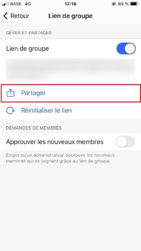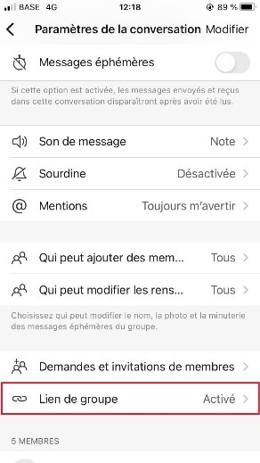 - Lorsque vous êtes dans la conversation de groupe, appuyez sur le nom du groupe en haut, pour aller aux paramètres de la conversation. Faites défiler l’écran vers le bas et appuyez sur Lien de groupe. Activez l'option Lien de groupe.