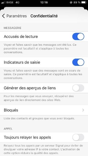 - Bloqués : Une option très utile dans Signal est de bloquer les contacts. Les contacts bloqués peuvent toujours vous appeler ou vous envoyer des messages (ils ne savent donc pas que vous les avez bloqués) mais vous ne pouvez plus voir leurs appels, ni leurs messages.